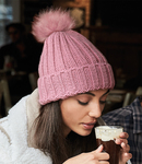 100% soft spun acrylic. Heavy ribbed knit.Cuffed design.Removable self colour faux fur pom pom.Tear out label.